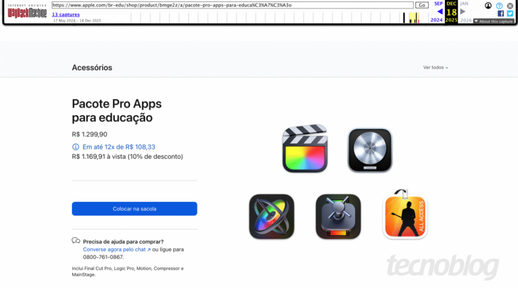 Página está fora do ar, mas foi salva no Wayback Machine (imagem: Giovanni Santa Rosa/Tecnoblog) Resumo A Apple descontinuou o